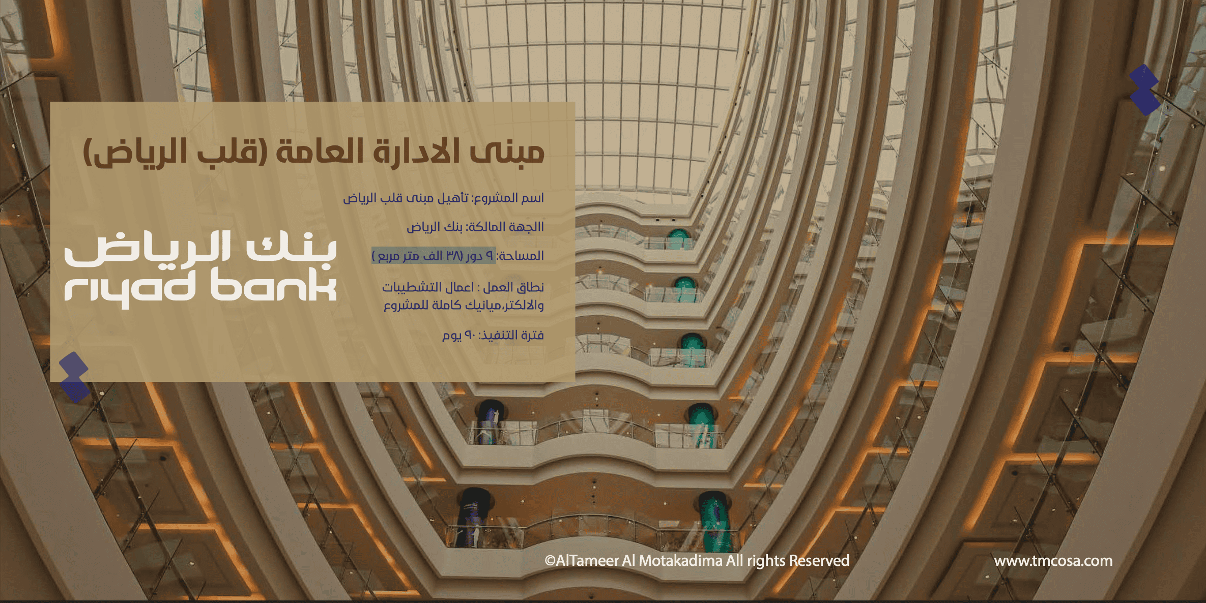 نفذت شركة التعمير المتقدمة مشروع تأهيل شامل لمبنى الإدارة العامة لبنك الرياض، الواقع في قلب العاصمة. تضمن المشروع تنفيذ أعمال تشطيب داخلية وخارجية كاملة، إلى جانب تطوير الأنظمة الكهربائية والميكانيكية وفق أعلى المواصفات الفنية.